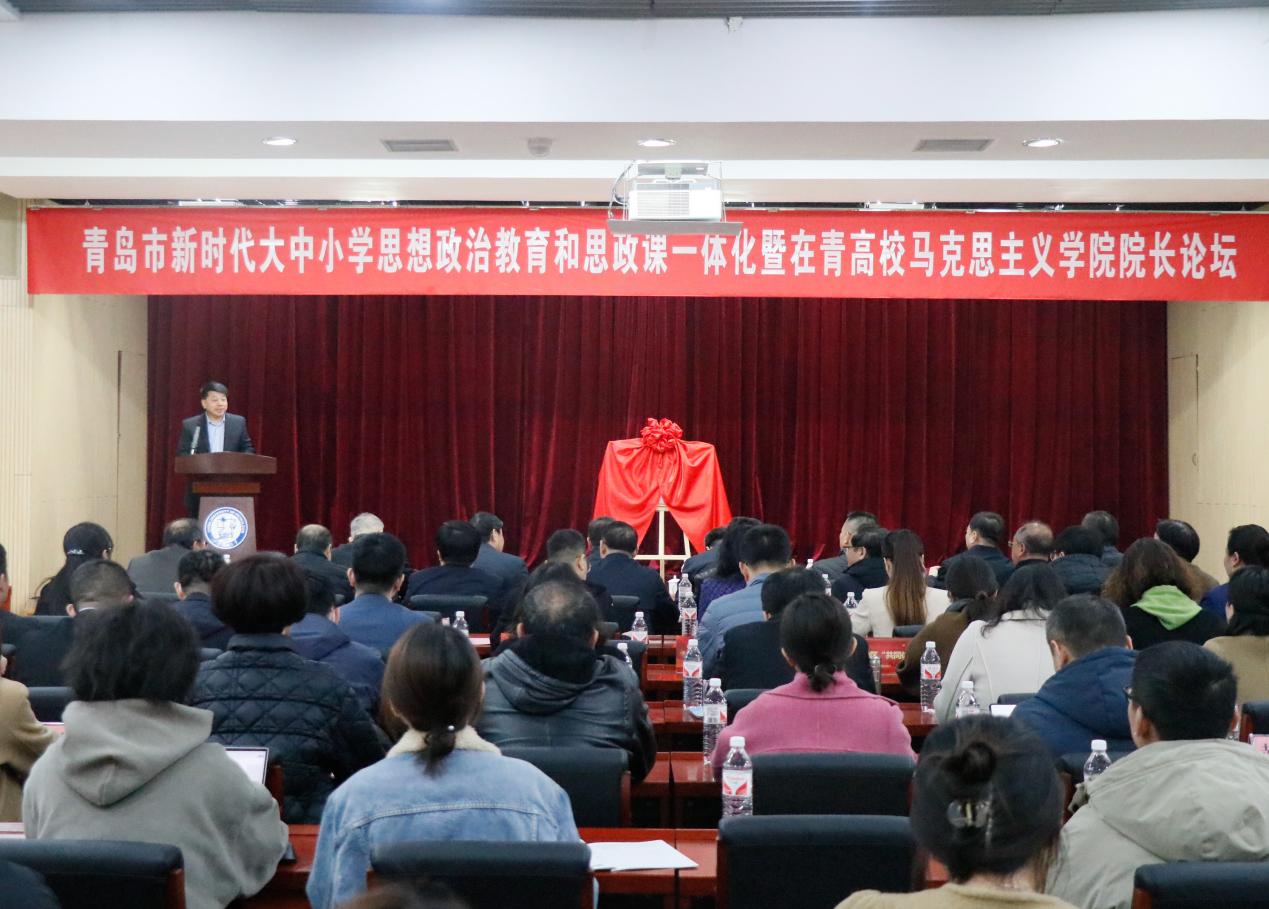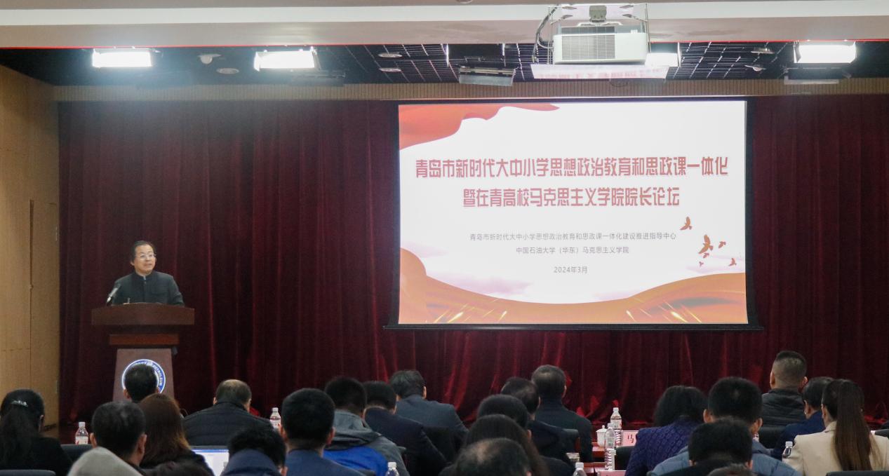 3月23日,青岛市新时代大中小学思想政治教育和思政课一体化暨在青高校yl23455永利官网院长论坛在yl23455永利官网(华东)唐岛湾校区逸夫报告厅隆重举行。学校党委副书记马国顺、青岛市教育局总督学李晓元出席开幕式并讲话,共同为“青岛市新时代大中小学思想政治教育和思政课一体化建设推进指导中心”(以下简称“指导中心”)揭牌。揭牌仪式由学院党委书记司江伟主持,“指导中心”领导成员,以及全市各大中小学思政课一体化建设共同体单位负责人、高校yl23455永利官网院长等200余名师生参加仪式。