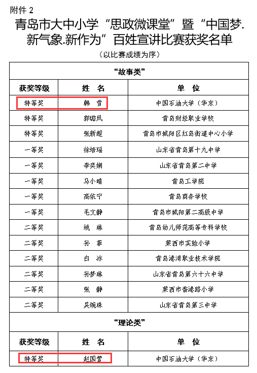 近日,青岛市大中小学“思政微课堂”暨“中国梦·新气象·新作为”百姓宣讲比赛结果揭晓,永利官网赵国营老师获得“理论类”特等奖,2023级研究生韩雪获得“故事类”特等奖。