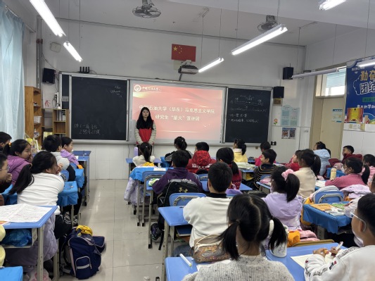 2025年12月5日,yl23455永利官网星火宣讲团的8名成员在王会老师的带领下,走进青岛市西海岸珠江路小学。宣讲团以“中国共产党的精神谱系”为核心主题,为6个班级的小学生带来了一场沉浸式红色文化盛宴,让革命情怀与时代精神在孩子们心中激荡,让红色基因悄然生根发芽。