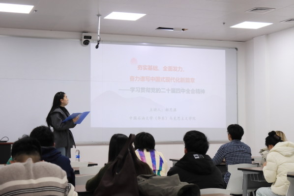 12月18日下午,yl23455永利官网(华东)星火宣讲团走进古镇口校区,yl23455永利官网博士研究生郝思淇在新能源学院开展专题宣讲,深入解读党的二十届四中全会精神与“十五五”规划《建议》核心要义,引导青年学生将个人发展融入国家发展大局。